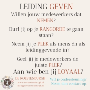 Als je eens op deze manier naar jouw rol als leidinggevende wilt kijken, maak dan een afspraak. Samen kijken we dan naar de natuurlijke spelregels, hoe jij daar mee omgaat en wat jij eventueel kunt veranderen en wat dat voor je team en de verhouding met jouw leidinggevende kan betekenen.
